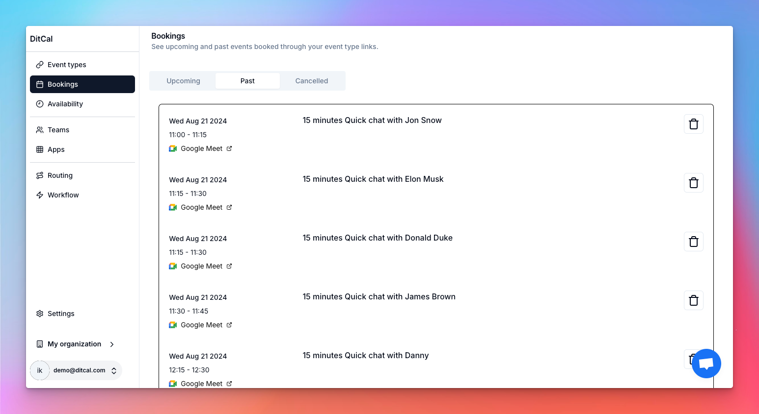 Bookings in DitCal are the result of someone scheduling an appointment using your Event Type link. They represent confirmed meetings, complete with all the relevant details, and serve as the cornerstone of your scheduling workflow.